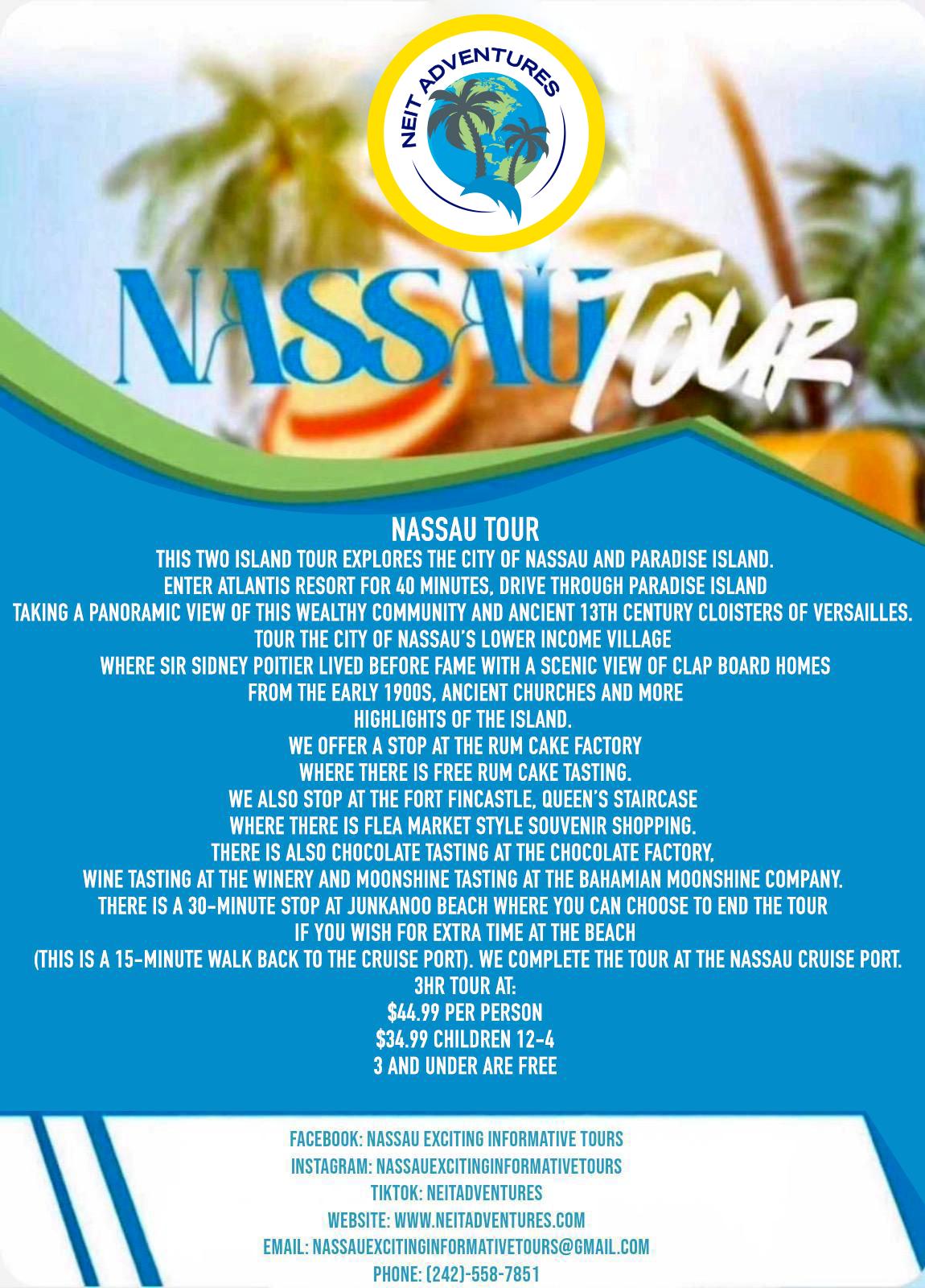 This two-island tour explores the city of Nassau and Paradise Island. Enter the Atlantis resort for 40 minutes, drive through Paradise Island, taking a panoramic view of this wealthy community and the ancient 13th-century Cloisters of Versailles. Tour the city of Nassau’s lower-income village where Sir Sidney Poitier lived before fame, which has a scenic view of clapboard homes from the early 1900s, ancient churches, and more highlights of the island. We offer a stop at the Rum Cake factory, where there is free rum cake tasting. We also stop at the Fort Fincastle, Queen’s Staircase, where there is flea market-style souvenir shopping. There is also chocolate tasting at the Chocolate Factory, wine tasting at the winery, and moonshine tasting at the Bahamian Moonshine Company. There is a 30-minute stop at Junkanoo Beach where you can choose to end the tour if you wish for extra time at the beach (this is a 15-minute walk back to the cruise port). We complete the tour at the Nassau cruise port.